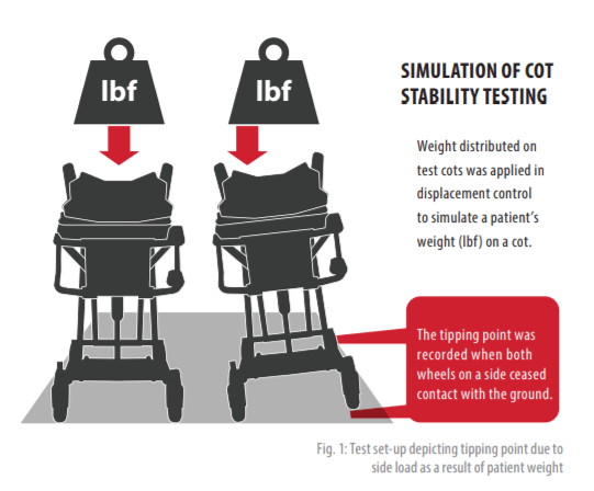 EMS cot stability is important during the transfer of patients. Loss of stability can lead to injury to EMS professionals or further patient injury. The resistance to tip due to applied offset loading, which can often occur with a seated patient or a patient being transferred to the bedside, was assessed in this study. Significant differences existed between the POWER X1 and Power-PRO XT cots with regard to the force required to tip. Across all three tested bed heights, the POWER X1, which features TipRESIST Advanced Stability Technology, provided 52% greater stability on average and 82% more at transport height than the Power-PRO XT.Key Definitions