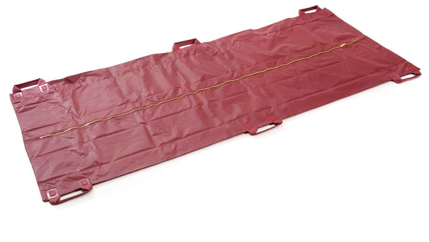 Heavy-duty, vinyl-coated nylon fabric makes a sturdy pouch. This pouch features a full-length, brass zipper. Six strong, easy-to-grip carrying handles permit the pouch to be used as a litter.